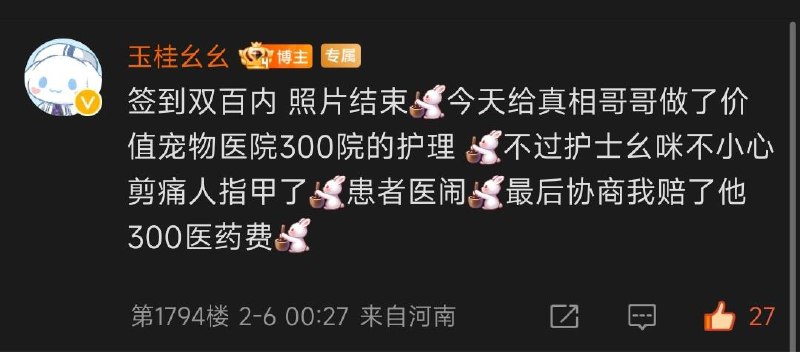 签到双百内 照片结束今天给真相哥哥做了价值宠物医院300院的护理 不过护士幺咪不小心剪痛人指甲了患者医闹最后协商我赔了他300医药费